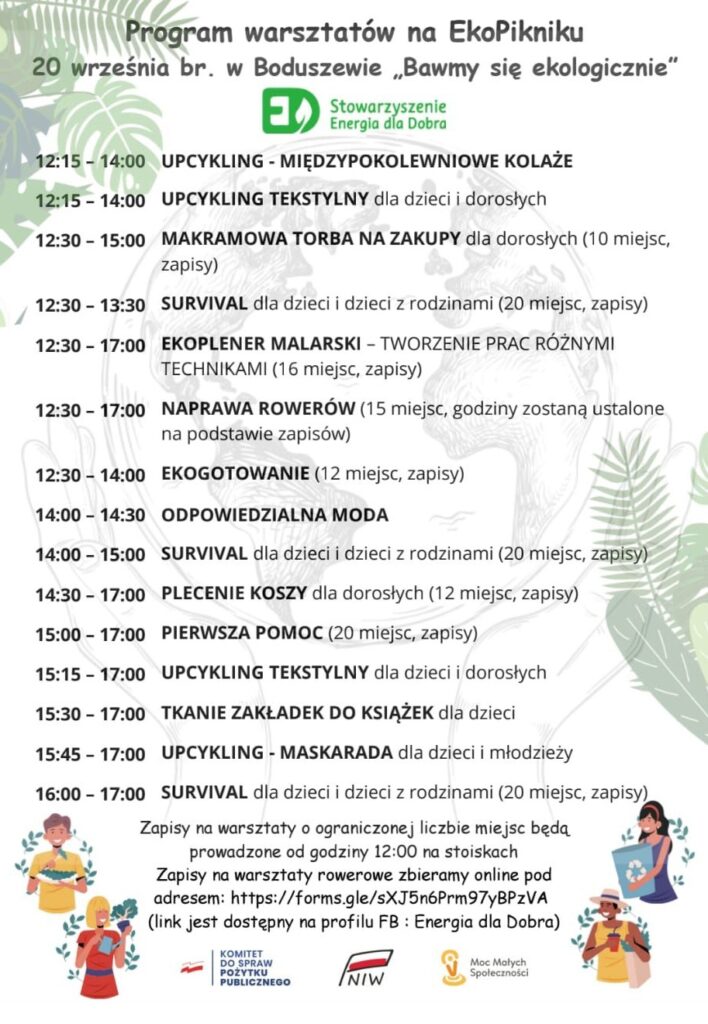 Stowarzyszenie Energia dla Dobra zapraszamy wszystkich na EkoPiknik do Boduszewa, który odbędzie się 20 września o godzinie 12:00. W programie wiele darmowych atrakcji oraz warsztatów: