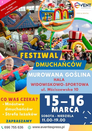 W dniach 15 i 16 marca (sobota-niedziela) w godz. 11:00 – 19:00 w hali widowiskowo-sportowej przy ul. Mściszewskiej 10 odbędzie się Mega Festiwal Dmuchańców. Czekają na Was wielkie dmuchańce, mnóstwo atrakcji i niezapomniane chwile dla całej rodziny! Prawdziwy raj dla dzieci – cała hala wypełniona dmuchańcami. Dla rodziców leżaczki i strefa chilloutu.